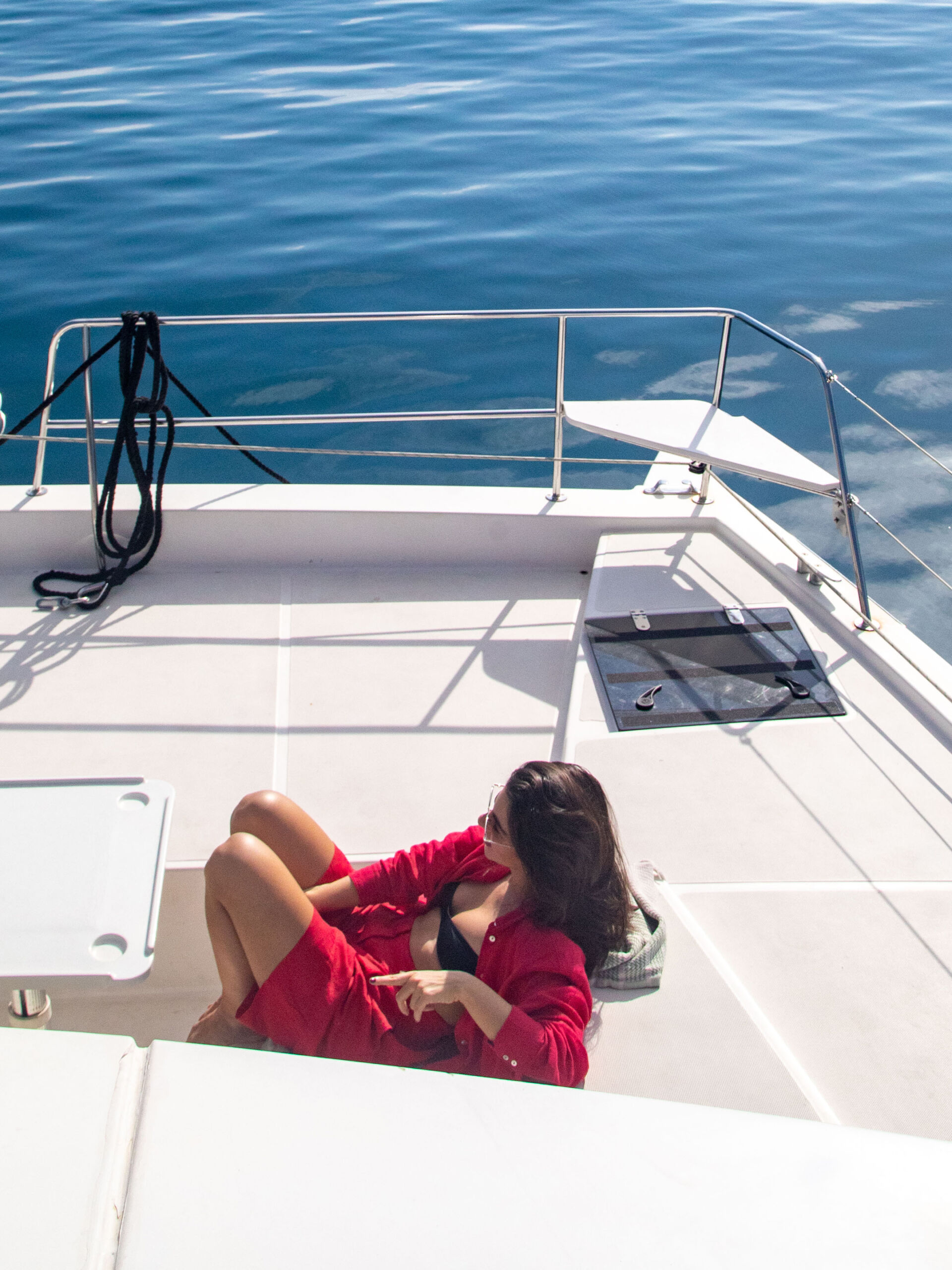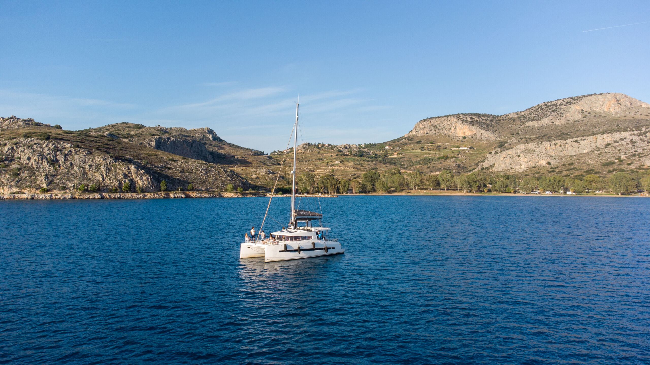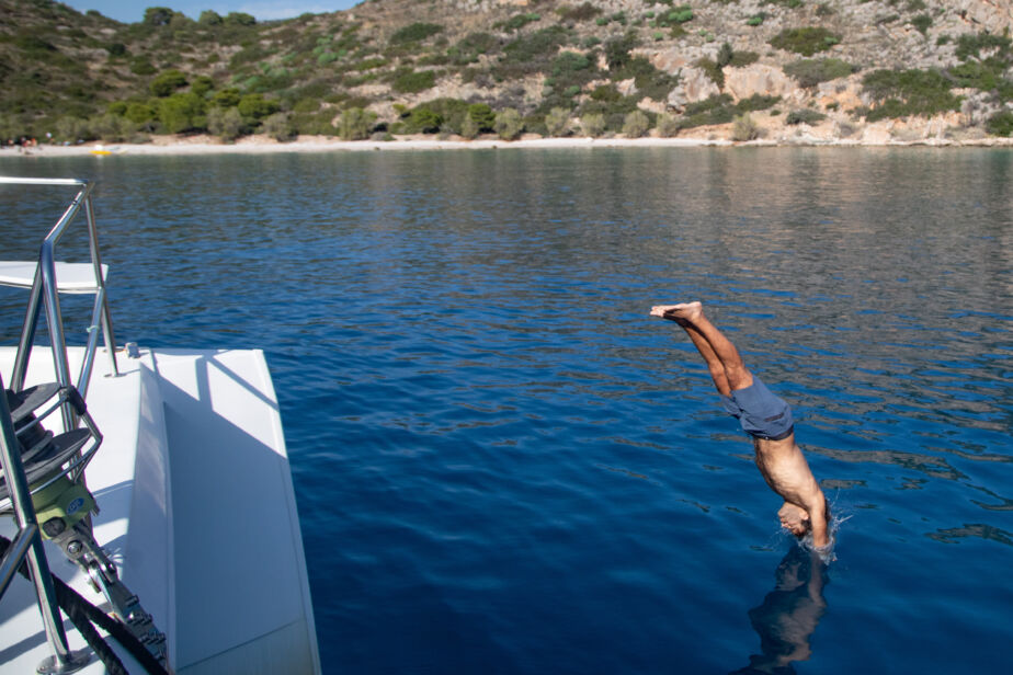 Our catamaran Calypso blends contemporary style with island-inspired relaxation, offering air-conditioned comfort, freshwater, and full onboard power, all enhanced by the warmth of Greek hospitality for a carefree day at sea.